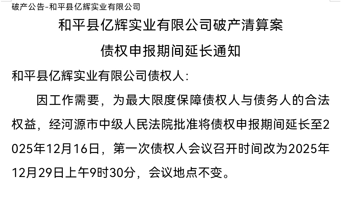 和平县亿辉实业有限公司破产清算案债权申报期间延长通知